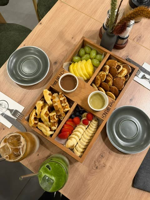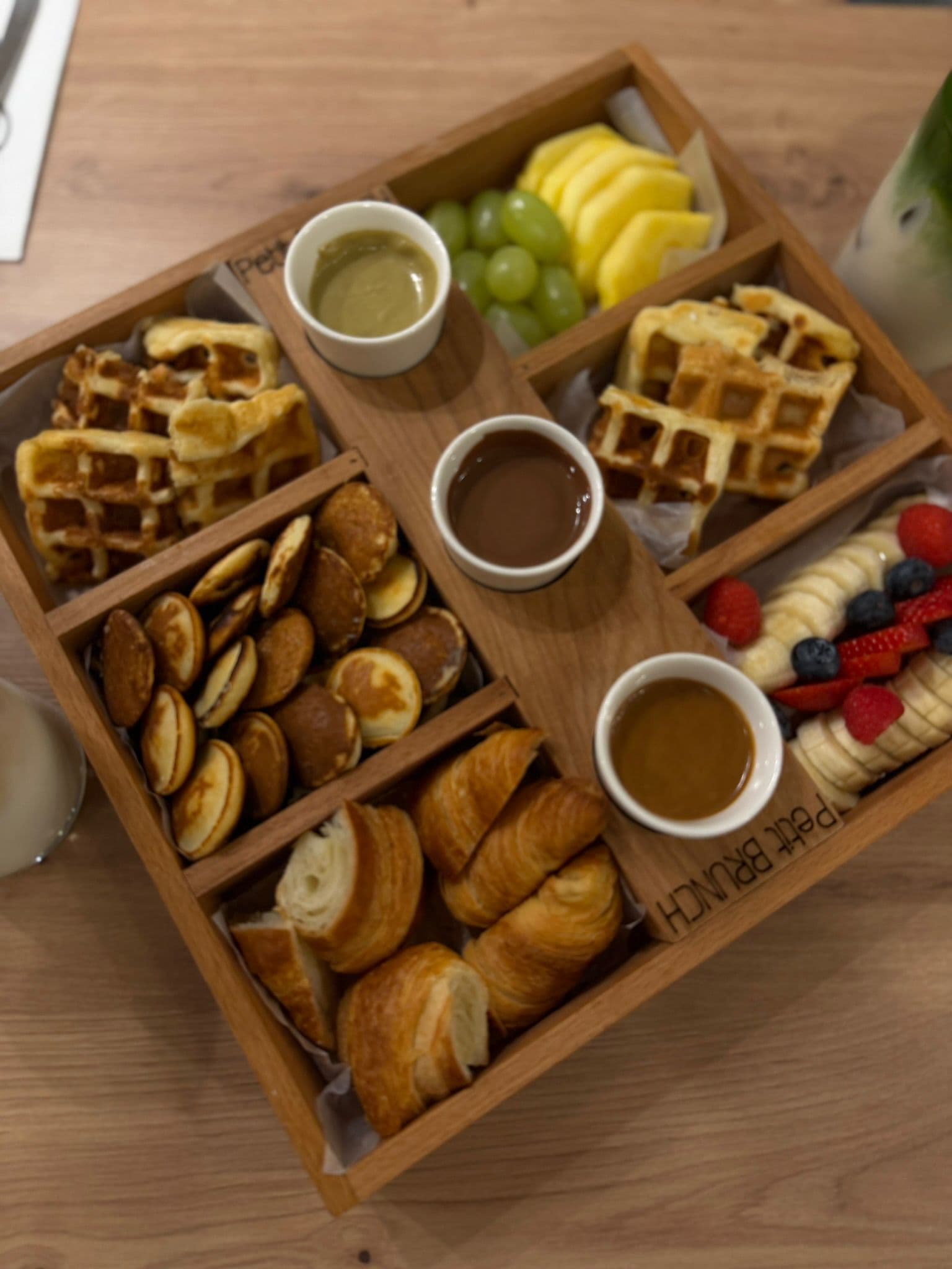 Mini pancakes, waffles, croissants, fruit, chocolate, lotus, and pistachio cream. Ideal for 3-4 people.