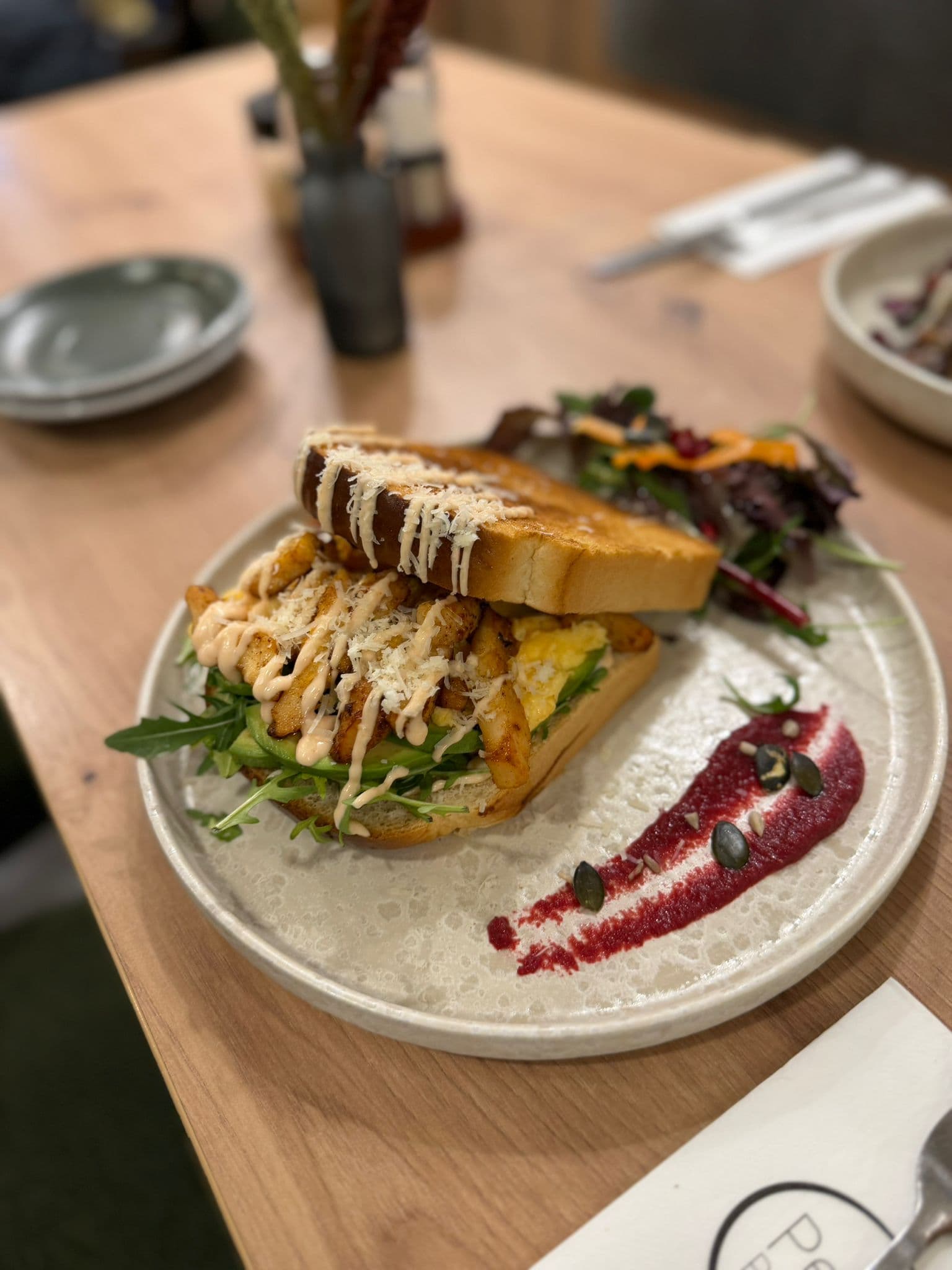 Brioche, chicken, scrambled eggs with truffle oil, avocado and chili mayo