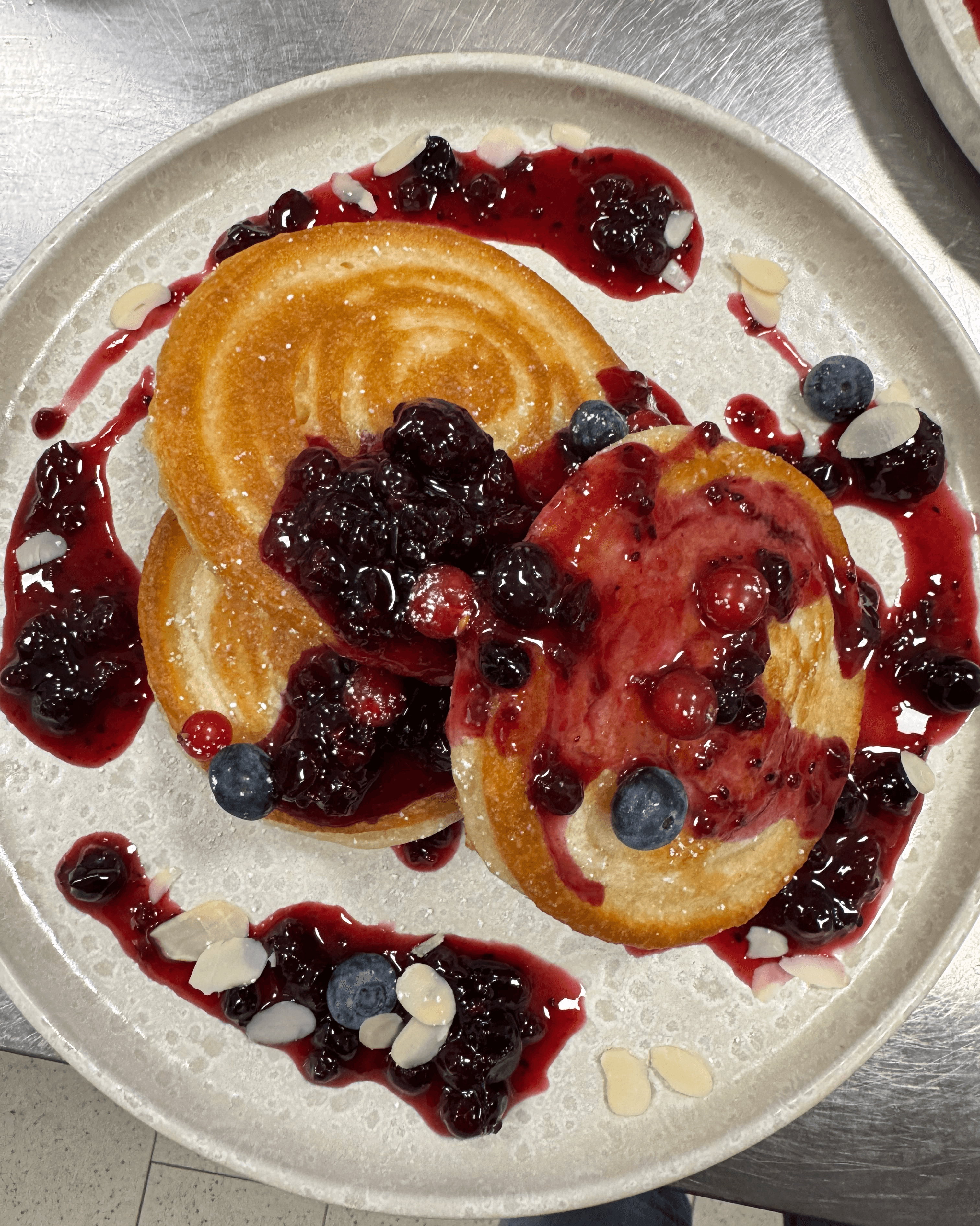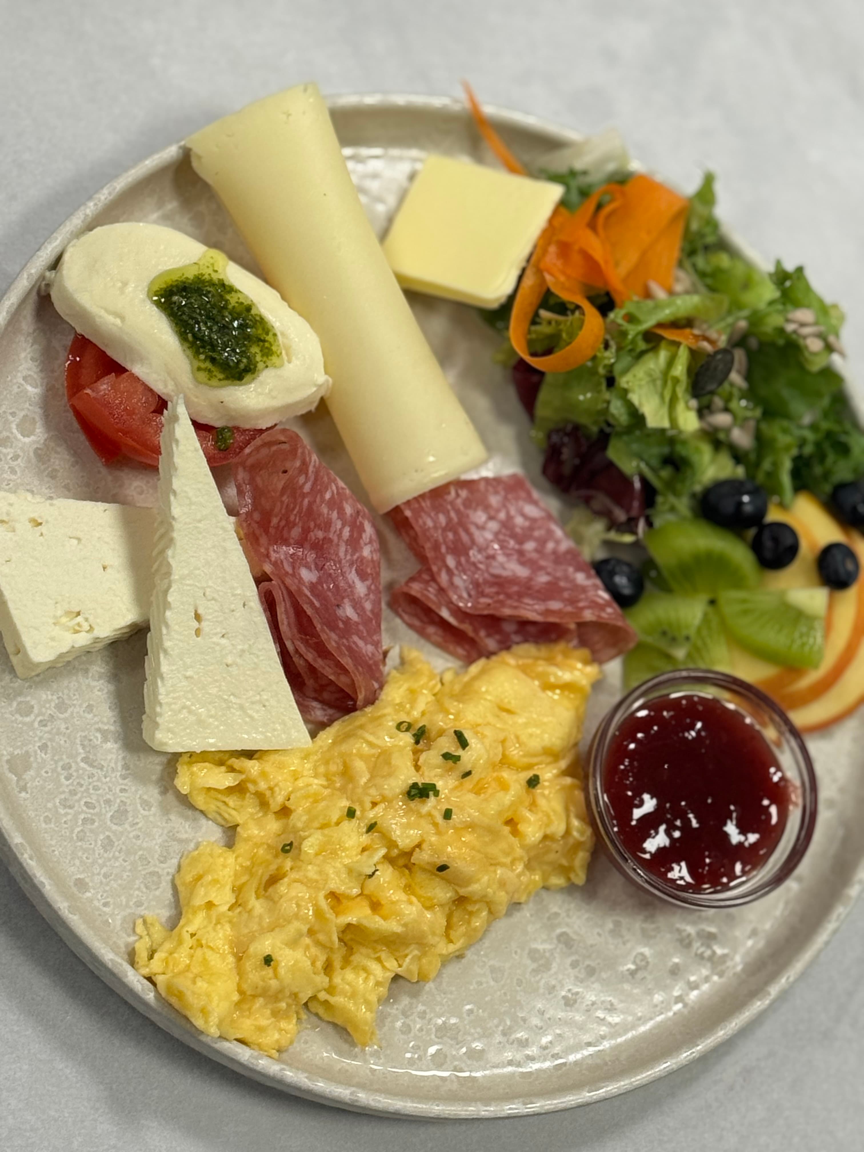 with cheese, salami, scrambled eggs, butter, and homemade jam