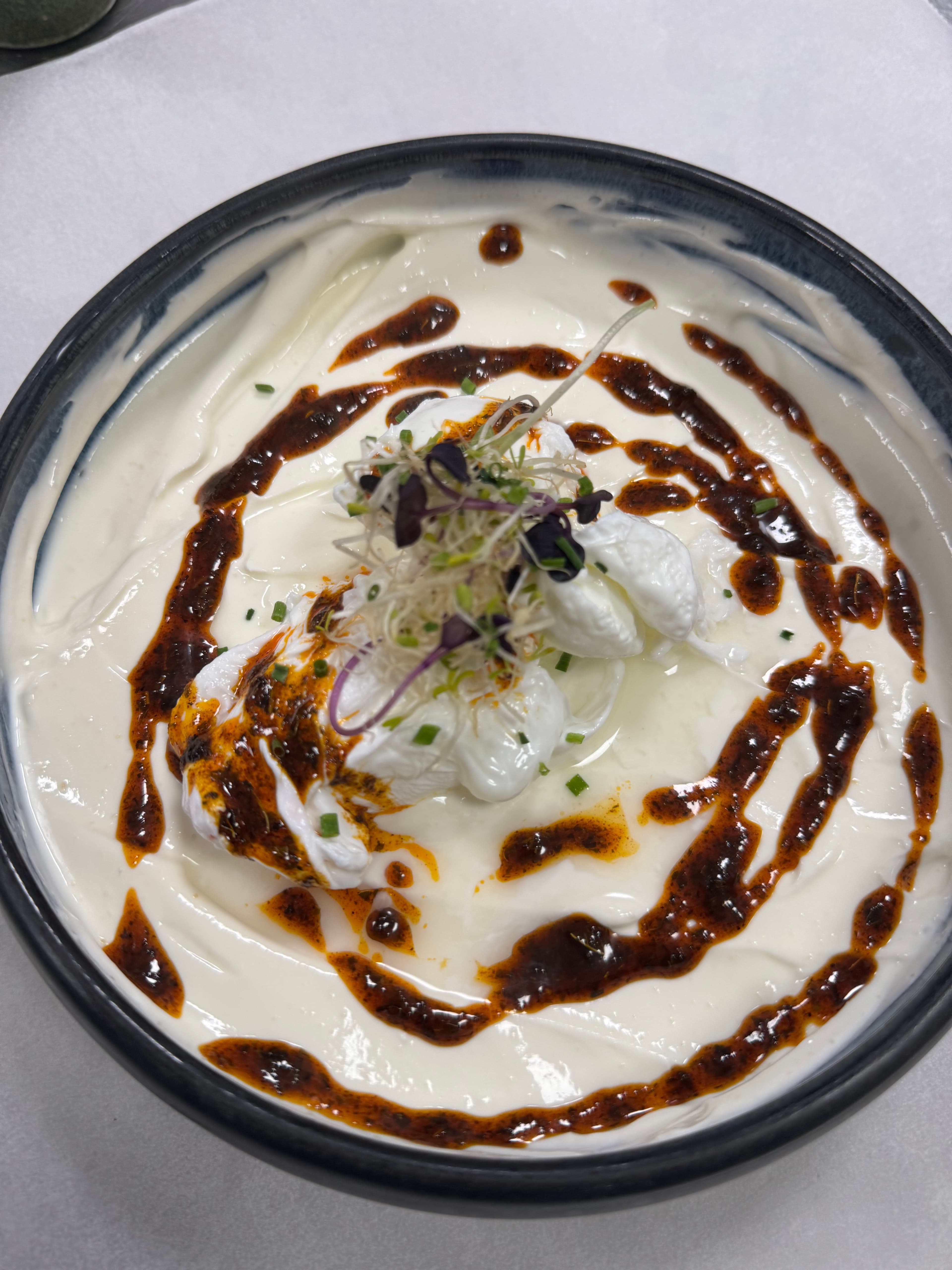 Garlic yogurt with spicy tomato-butter sauce, two poached eggs, and bread