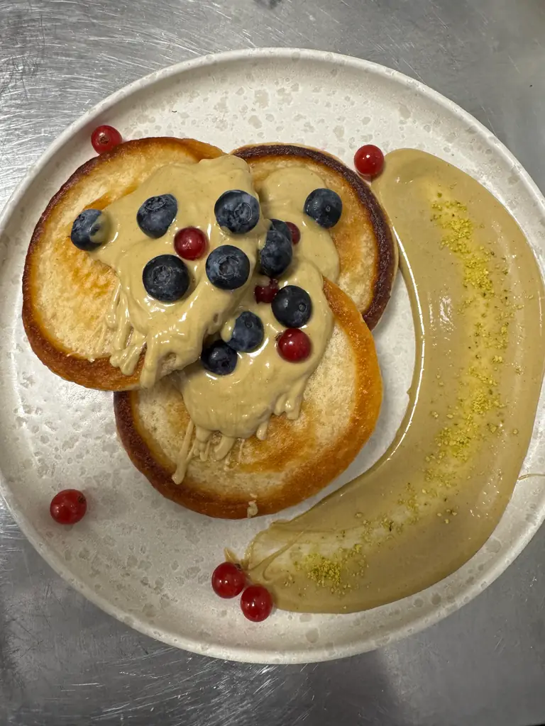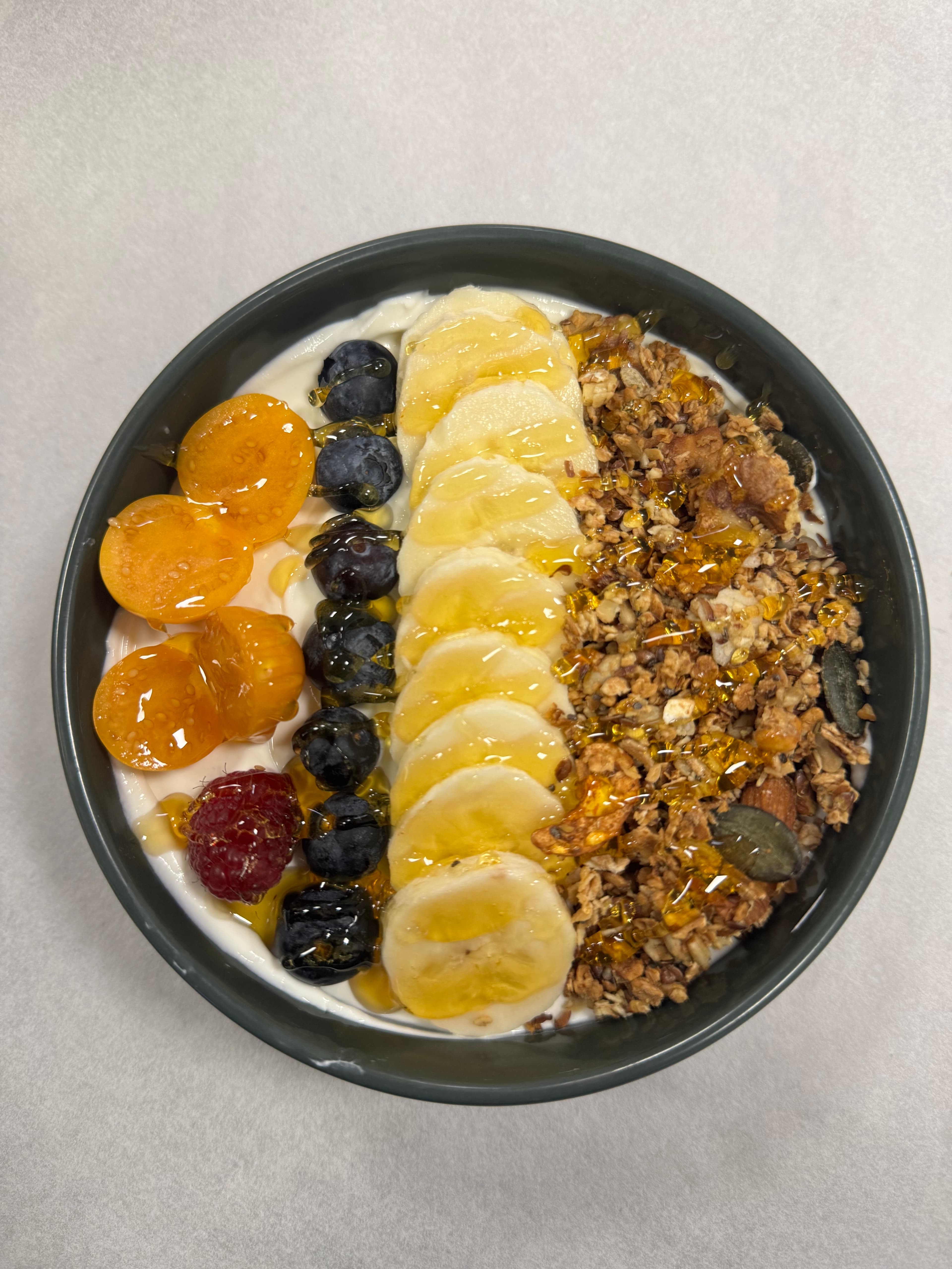 Bananas, passion fruit purée, dates, mango purée, coconut yogurt, topped with homemade granola, goji berries, chia seeds, and seasonal fruits