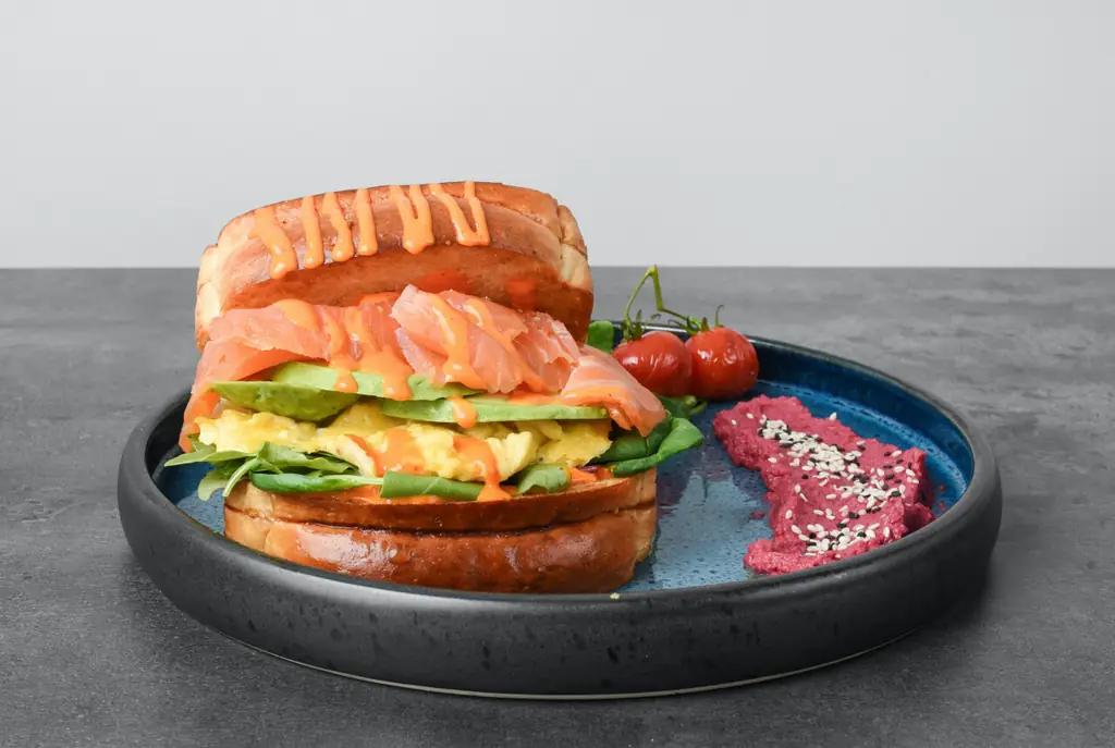 Sourdough bread with scrambled eggs, hummus, smoked salmon, and avocado