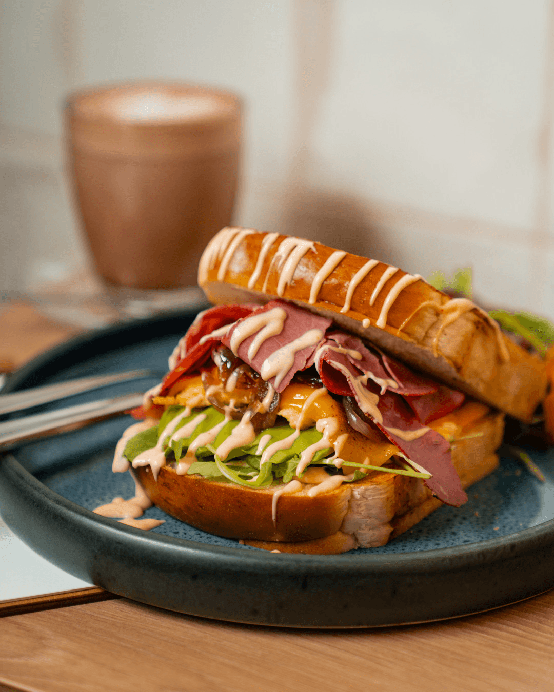 With scrambled eggs, pastrami, avocado, caramelized onions, and homemade chili mayo