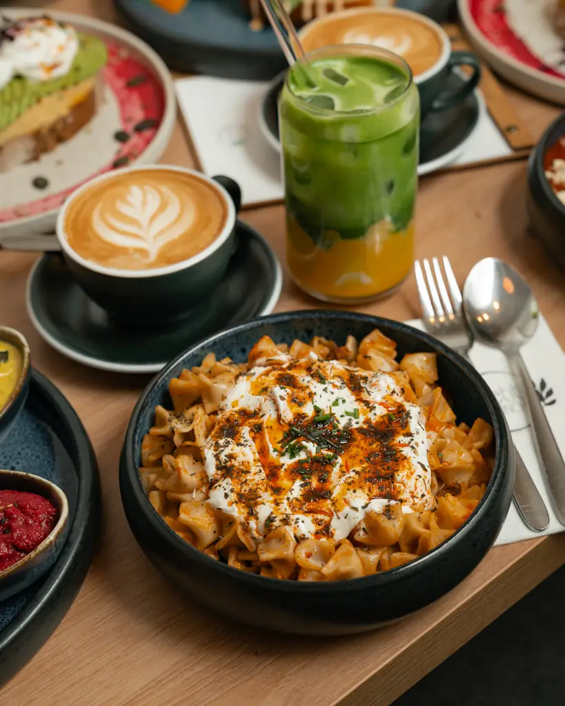 Vegan Turkish mini ravioli filled with Spinach, served with soy yogurt and a tomato paste sauce